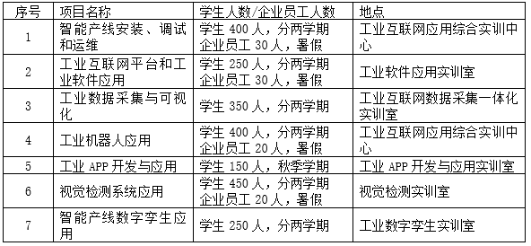 “工業(yè)互聯(lián)網(wǎng)產(chǎn)業(yè)聯(lián)盟 杭州科技職業(yè)技術(shù)學(xué)院工業(yè)互聯(lián)網(wǎng)應(yīng)用實(shí)訓(xùn)基地”建有:智能系統(tǒng)集成技術(shù)實(shí)訓(xùn)中心、工業(yè)互聯(lián)網(wǎng)應(yīng)用綜合實(shí)訓(xùn)中心、工業(yè)控制系統(tǒng)實(shí)訓(xùn)室、工業(yè)互聯(lián)網(wǎng)數(shù)據(jù)采集一體化實(shí)訓(xùn)室、工業(yè)APP開發(fā)與應(yīng)用實(shí)訓(xùn)室、工業(yè)軟件應(yīng)用實(shí)訓(xùn)室、工業(yè)數(shù)字孿生實(shí)訓(xùn)室、視覺檢測(cè)實(shí)訓(xùn)室、工業(yè)機(jī)器人應(yīng)用實(shí)訓(xùn)室等專業(yè)實(shí)訓(xùn)室,服務(wù)工業(yè)互聯(lián)網(wǎng)應(yīng)用、電氣自動(dòng)化技術(shù)、物聯(lián)網(wǎng)應(yīng)用技術(shù)、人工智能技術(shù)應(yīng)用、應(yīng)用電子技術(shù)等專業(yè)的20余門課程。實(shí)訓(xùn)基地開設(shè)的綜合實(shí)訓(xùn)項(xiàng)目有:智能產(chǎn)線安裝、調(diào)試和運(yùn)維、工業(yè)互聯(lián)網(wǎng)平臺(tái)和工業(yè)軟件應(yīng)用、工業(yè)數(shù)據(jù)采集與可視化、工業(yè)機(jī)器人應(yīng)用、工業(yè)APP開發(fā)與應(yīng)用、視覺檢測(cè)系統(tǒng)應(yīng)用、智能產(chǎn)線數(shù)字孿生應(yīng)用等。具體開設(shè)計(jì)劃如表1所示: