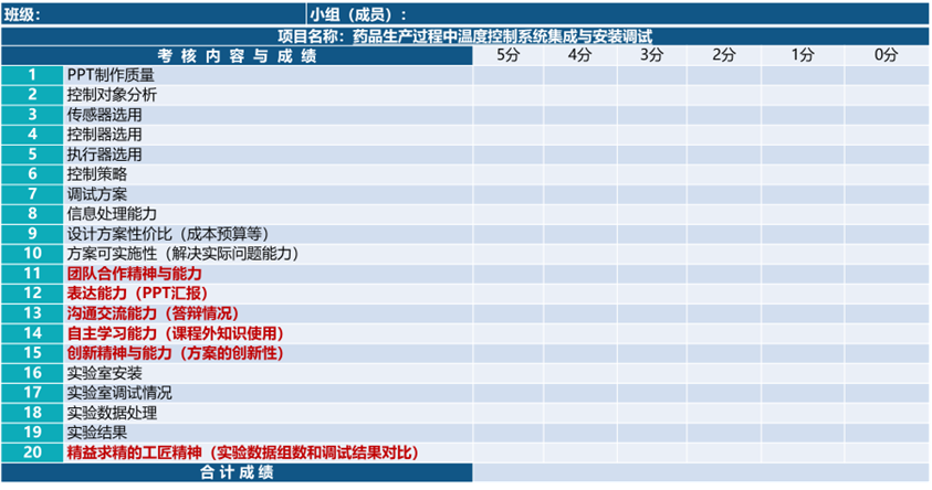 為了使實(shí)訓(xùn)項(xiàng)目達(dá)到預(yù)期培養(yǎng)目標(biāo),實(shí)訓(xùn)基地提出了“軟硬能力”并舉的考核評(píng)價(jià)方式。將硬能力分解為實(shí)訓(xùn)項(xiàng)目各技能點(diǎn),軟能力分解為表達(dá)溝通等綜合素養(yǎng)點(diǎn)。以“藥品生產(chǎn)過程中溫度控制系統(tǒng)集成與安裝調(diào)試”項(xiàng)目為例,具體的考核評(píng)價(jià)體系如圖6所示: