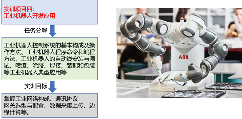 實(shí)訓(xùn)基地開展了眾多綜合實(shí)訓(xùn)項(xiàng)目:智能產(chǎn)線安裝、調(diào)試和運(yùn)維、工業(yè)互聯(lián)網(wǎng)平臺(tái)和工業(yè)軟件應(yīng)用、工業(yè)數(shù)據(jù)采集與可視化、工業(yè)機(jī)器人應(yīng)用、工業(yè)APP開發(fā)與應(yīng)用、視覺檢測(cè)系統(tǒng)應(yīng)用、智能產(chǎn)線數(shù)字孿生應(yīng)用等。