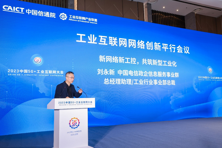 在新網(wǎng)絡(luò)新工控創(chuàng)新應(yīng)用分享環(huán)節(jié),中國電信政企信息服務(wù)事業(yè)群總經(jīng)理助理、工業(yè)行業(yè)事業(yè)部總裁劉永新做了《新網(wǎng)絡(luò)新工控,共筑新型工業(yè)化》主題演講,從理解新型工業(yè)化和助力新型工業(yè)化兩方面,與會(huì)眾分享了近年來中國電信在新型工業(yè)化方面的實(shí)踐。