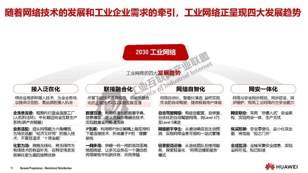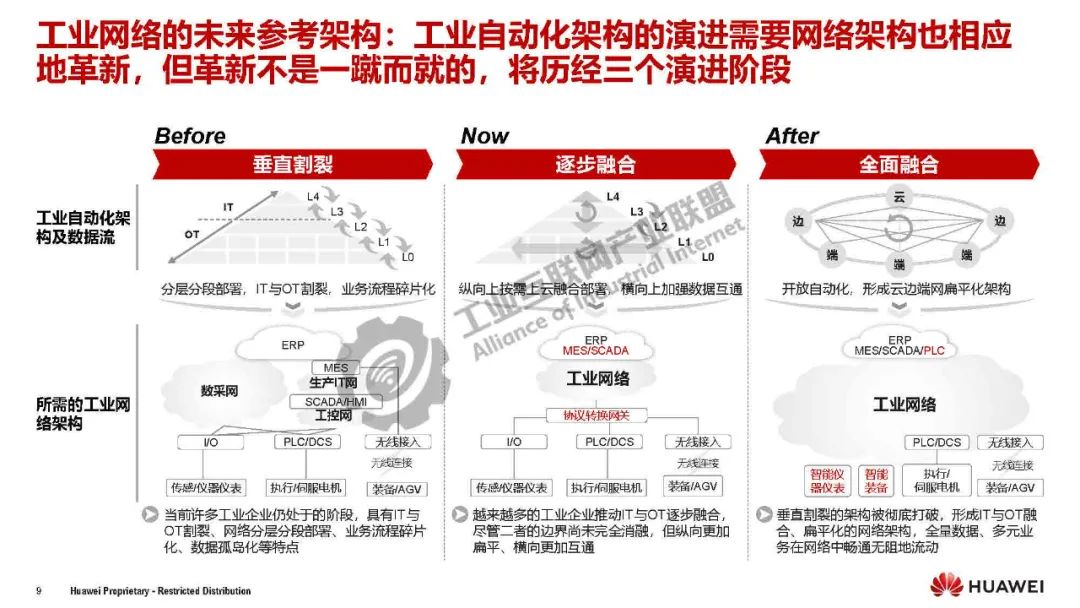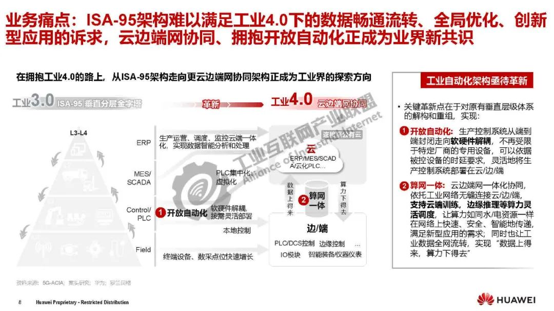 關(guān)鍵革新點(diǎn)在于對(duì)原有垂直層級(jí)體系的解構(gòu)和重組,實(shí)現(xiàn): ①開(kāi)放自動(dòng)化:生產(chǎn)控制系統(tǒng)從端到端耦合封閉走向分層解耦、開(kāi)放通用,不再受限于特定廠(chǎng)商的專(zhuān)用設(shè)備,可靈活地將生產(chǎn)控制系統(tǒng)部署在云/邊/端。②算網(wǎng)一體:云邊端網(wǎng)一體化協(xié)同,依托工業(yè)網(wǎng)絡(luò)無(wú)縫連接云/邊/端, 支持云端訓(xùn)練,邊緣推理等算力靈活調(diào)度,讓算力如同水/電資源一樣在網(wǎng)絡(luò)上快速、安全、智能地傳遞,滿(mǎn)足新型應(yīng)用的需求;同時(shí)也讓工業(yè)數(shù)據(jù)全網(wǎng)流轉(zhuǎn),實(shí)現(xiàn)“數(shù)據(jù)上得來(lái),算力下得去”。