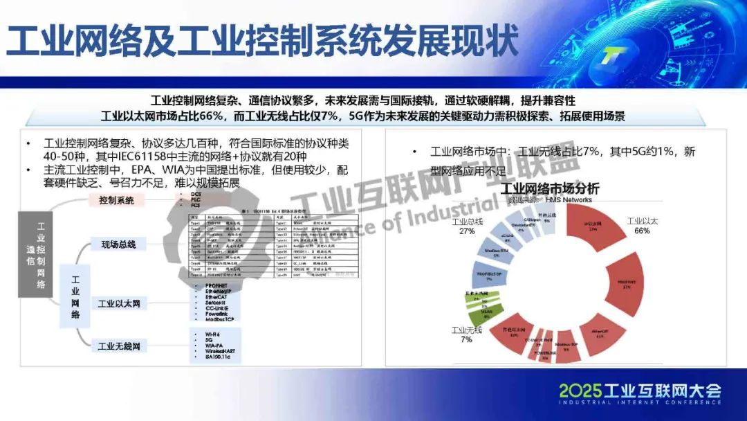 孫海介紹,工業控制網絡復雜、通信協議繁多,未來發展需與國際接軌,通過軟硬解耦,提升兼容性。工業以太網市場占比66%,而工業無線占比僅7%,5G作為未來發展的關鍵驅動力需積極探索、拓展使用場景。數實融合不斷深入,催生新場景、新業態、新模式,推動數字基礎設施持續升級,以5G為代表的新一代信息技術發揮重要作用。