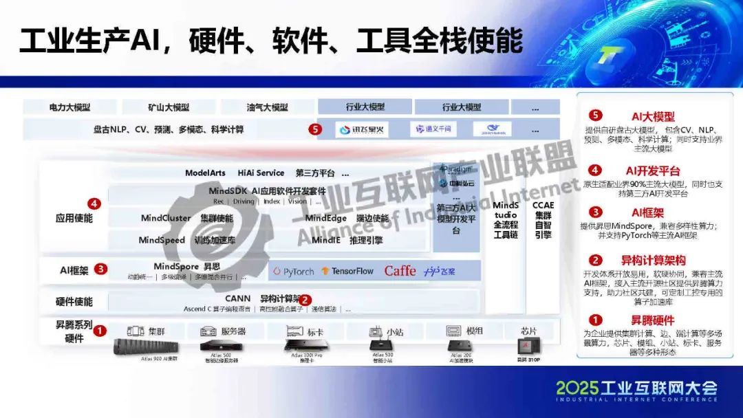 工業生產AI,包括Atlas、昇騰等技術和產品,以及MindStudio等全流程工具鏈,具有如下特征:一是全棧智能,算力芯片以及使能組件和開發工具鏈,盤古大模型。二是數據價值化,打通全量數據,突破工廠邊界,全面釋放數據價值。