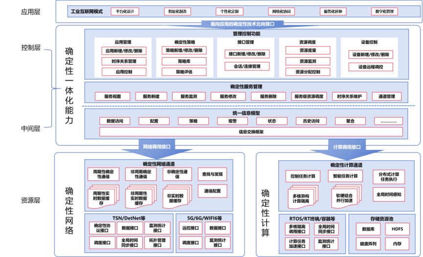 面向應(yīng)用的確定性技術(shù)架構(gòu)如下圖所示,與傳統(tǒng)工業(yè)網(wǎng)絡(luò)架構(gòu)不同的是,通過確定性一體化能力在資源之上的層面統(tǒng)籌確定性網(wǎng)絡(luò)和確定性計(jì)算。其中,確定性服務(wù)管理創(chuàng)新性地圍繞工業(yè)生產(chǎn)中應(yīng)用協(xié)同關(guān)系編排算網(wǎng)資源,并保障整個流程的確定性。確定性服務(wù)的指標(biāo)可以落地到確定性網(wǎng)絡(luò)指標(biāo)和確定性計(jì)算指標(biāo),從而滿足控網(wǎng)算融合過程中的緊密協(xié)同需求。管理控制功能提供了應(yīng)用、策略、設(shè)備、資源等全局調(diào)度能力,相關(guān)策略對全工廠的確定性服務(wù)進(jìn)行動態(tài)優(yōu)化,再將配置信息通過統(tǒng)一信息模型、網(wǎng)絡(luò)調(diào)用接口和計(jì)算調(diào)用接口下發(fā)到資源層。