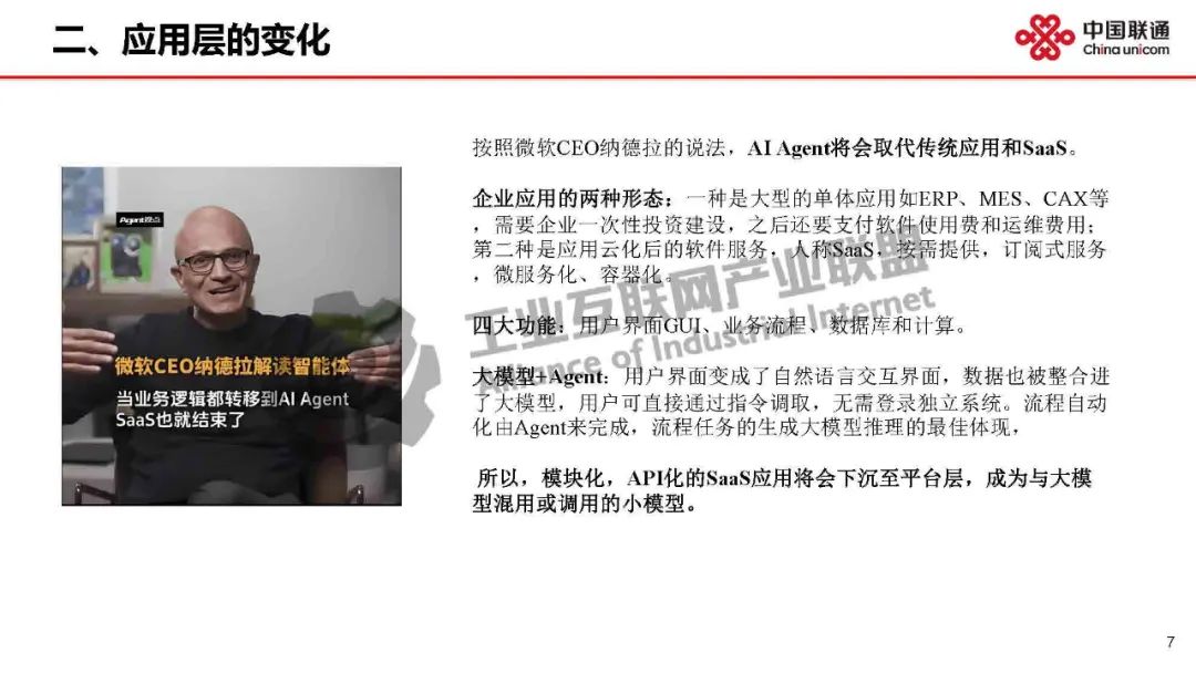 同樣,應用也會從云原生低代碼開發演進到AI大模型驅動的軟件工廠,變成任務型或崗位型Agent數字人,給應用層的SaaS帶來根本性變化。