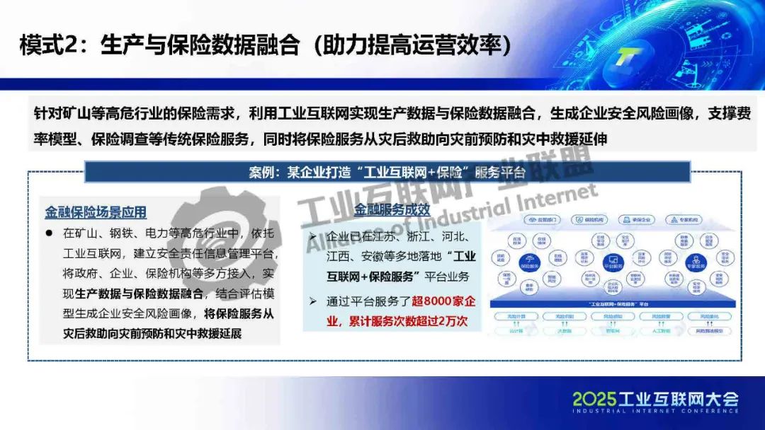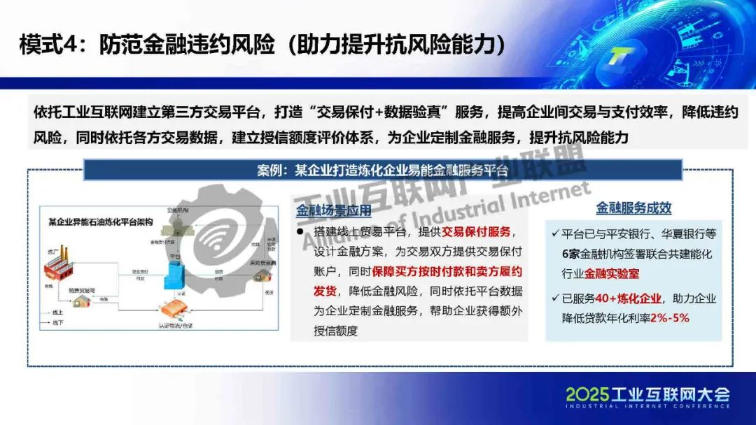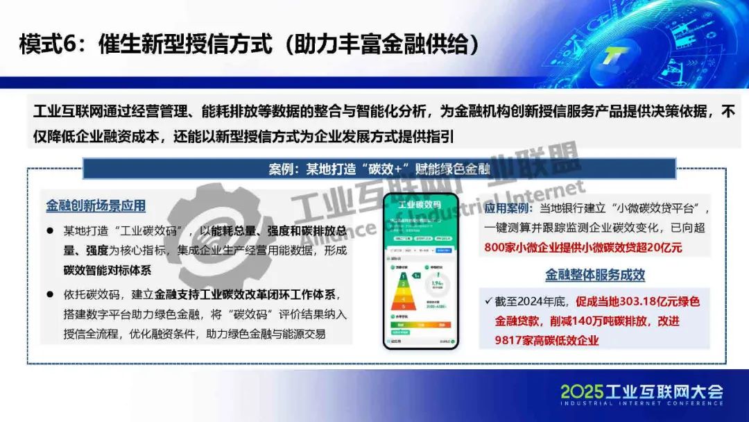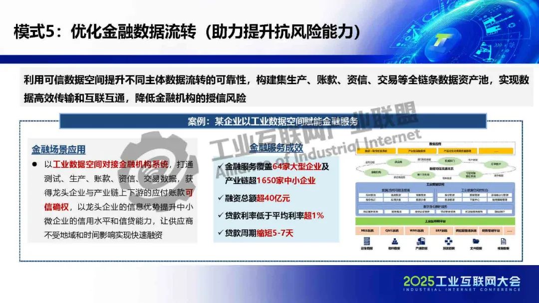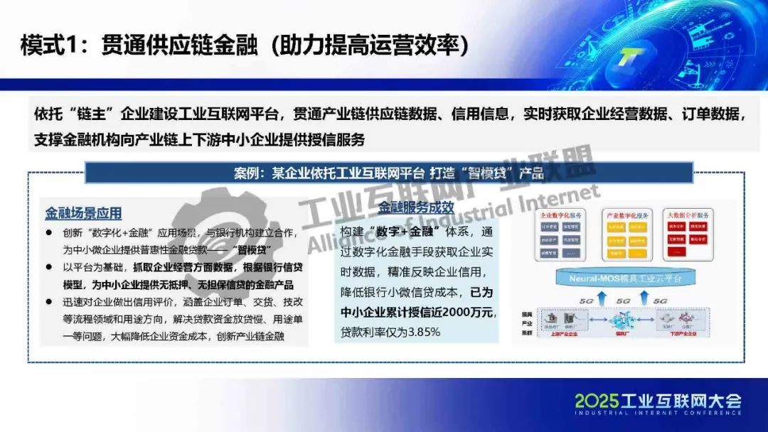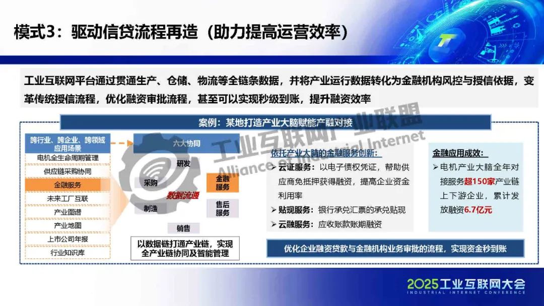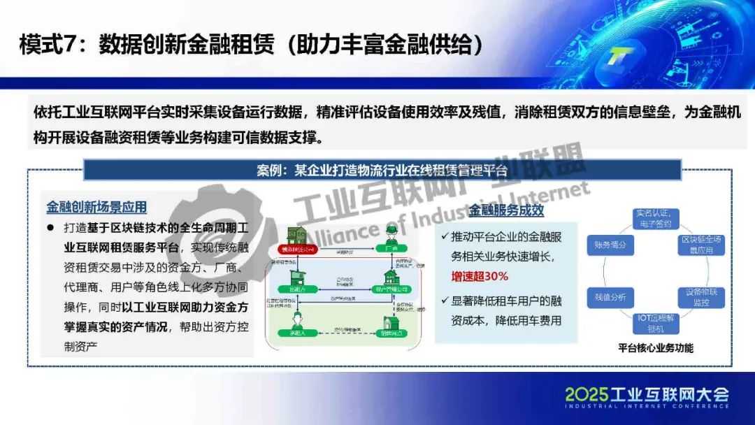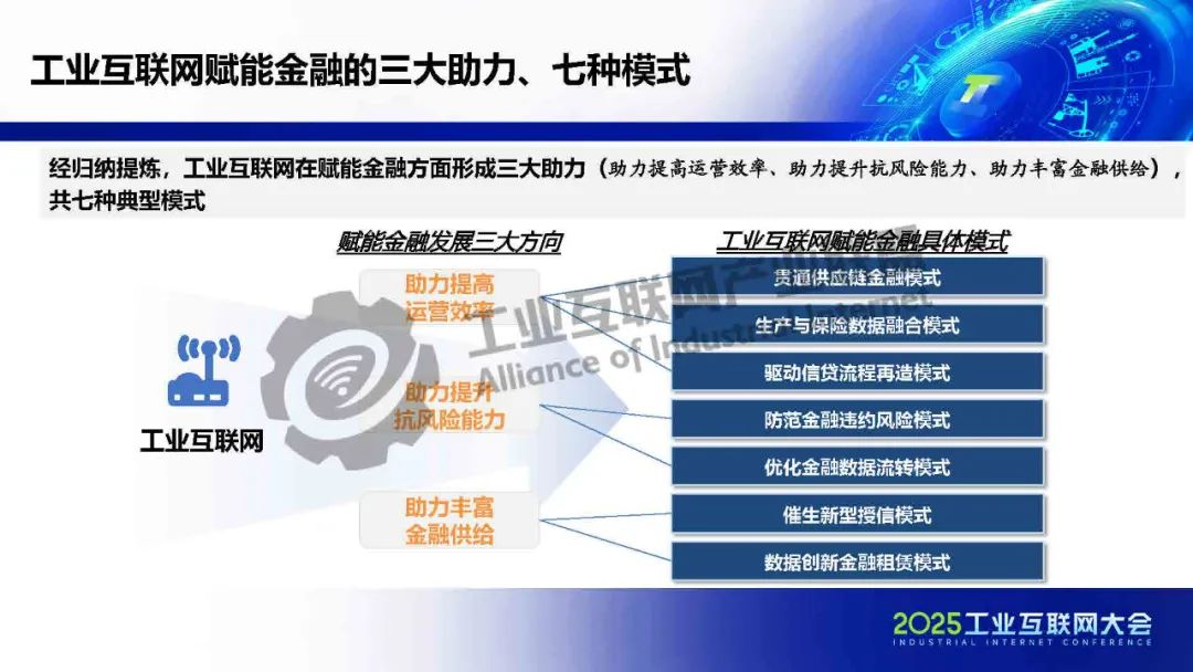 貫通供應鏈金融工業互聯網在賦能金融方面形成三大助力(助力提高運營效率、助力提升抗風險能力、助力豐富金融供給),共七種典型模式:貫通供應鏈金融、生產與保險數據融合、驅動信貸流程再造、防范金融違約風險、優化金融數據流轉、催生新型授信方式和數據創新金融租賃。
