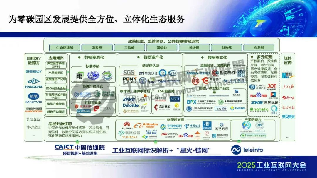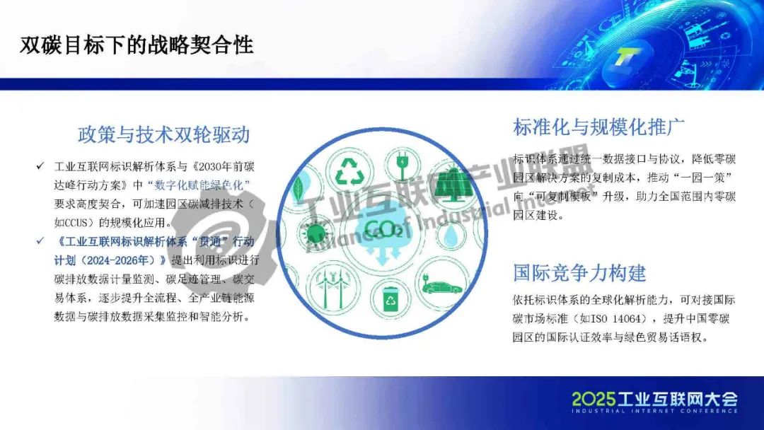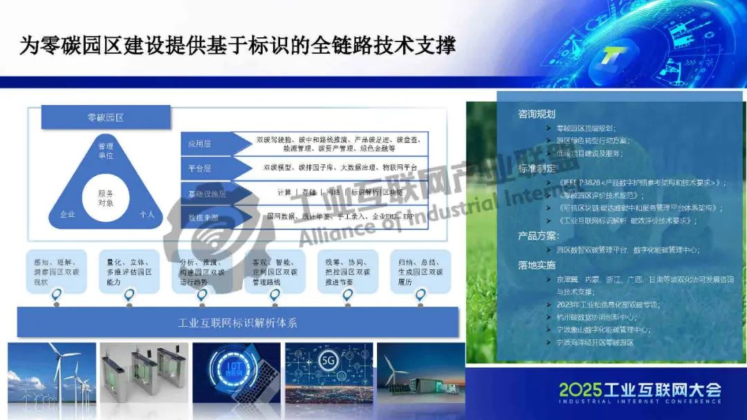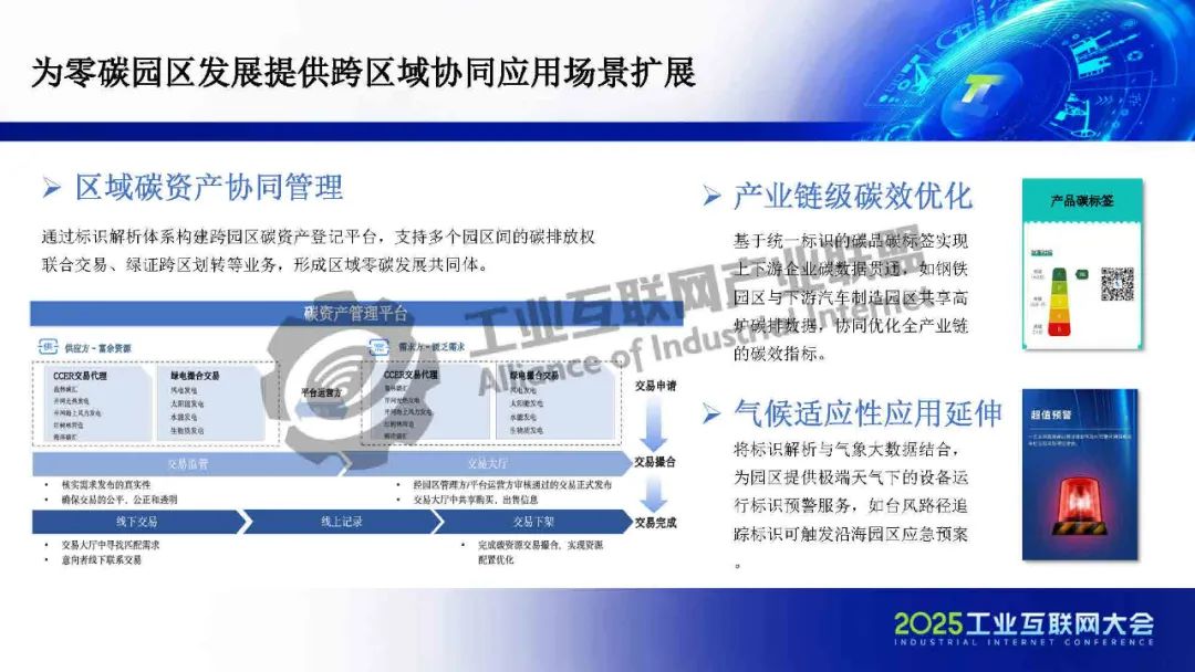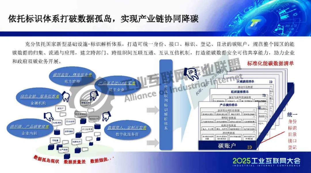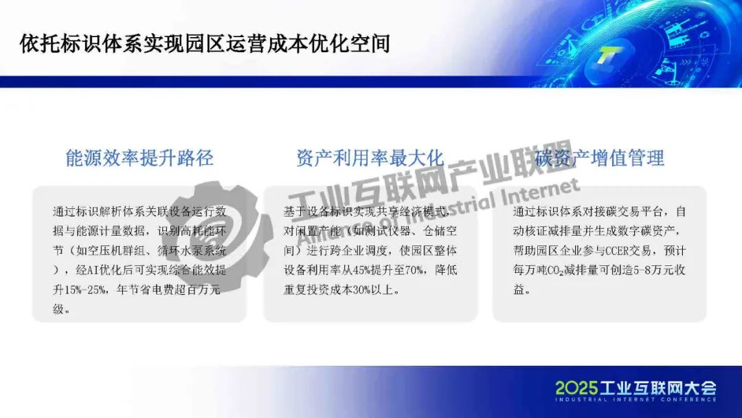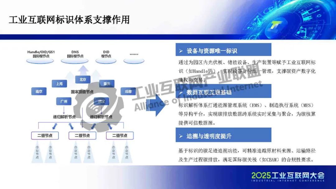 在園區(qū)建設(shè)方面,標(biāo)識(shí)體系作為工信部推動(dòng)全行業(yè)互聯(lián)互通的核心基礎(chǔ)設(shè)施,承擔(dān)著打破行業(yè)壁壘、賦能企業(yè)數(shù)字化升級(jí)的重要使命。一方面,依托標(biāo)識(shí)體系,可以為企業(yè)、產(chǎn)品和設(shè)備賦予統(tǒng)一、可信的數(shù)字身份,實(shí)現(xiàn)數(shù)據(jù)的精準(zhǔn)溯源與全流程管理,為能源效率提升和碳資產(chǎn)增值管理提供有力支撐,從而釋放園區(qū)運(yùn)營成本優(yōu)化空間。另一方面,標(biāo)識(shí)體系有助于打通企業(yè)內(nèi)部及產(chǎn)業(yè)鏈上下游的信息壁壘,破解數(shù)據(jù)孤島,進(jìn)一步提升供應(yīng)鏈的低碳協(xié)同效率。