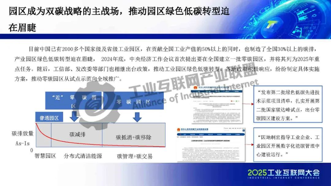 曾西平表示,綠色低碳發(fā)展已成為全球共識(shí),工業(yè)園區(qū)是實(shí)現(xiàn)國家“3060”雙碳目標(biāo)的關(guān)鍵陣地。目前我國擁有2000多個(gè)國家級(jí)和省級(jí)工業(yè)園區(qū),這些園區(qū)貢獻(xiàn)了全國50%以上的工業(yè)產(chǎn)值,碳排放總量占全國的30%以上,是推動(dòng)“雙碳”戰(zhàn)略目標(biāo)落地的主力軍。2024年底,中央經(jīng)濟(jì)工作會(huì)議首次將零碳園區(qū)建設(shè)列為2025年重點(diǎn)任務(wù),隨后多部委密集出臺(tái)政策,全面加快工業(yè)園區(qū)綠色低碳轉(zhuǎn)型步伐。