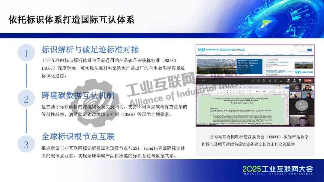 在國際互認(rèn)方面,依托標(biāo)識(shí)體系,可以構(gòu)建中國零碳園區(qū)國際認(rèn)證的高效互認(rèn)體系,增強(qiáng)我國在綠色貿(mào)易中的話語權(quán)。基于標(biāo)識(shí)解析的跨境碳數(shù)據(jù)交換網(wǎng)關(guān),能夠支持不同國家碳核算方法學(xué)的等效轉(zhuǎn)換,滿足歐盟碳邊境調(diào)節(jié)機(jī)制(CBAM)等國際合規(guī)要求,實(shí)現(xiàn)跨境碳數(shù)據(jù)的互認(rèn)。此外,工業(yè)互聯(lián)網(wǎng)標(biāo)識(shí)解析體系還與國際通用的產(chǎn)品碳足跡核算標(biāo)準(zhǔn)ISO14067深度對(duì)接,可實(shí)現(xiàn)產(chǎn)品從原材料采購到出廠全生命周期碳足跡的標(biāo)識(shí)化追蹤。