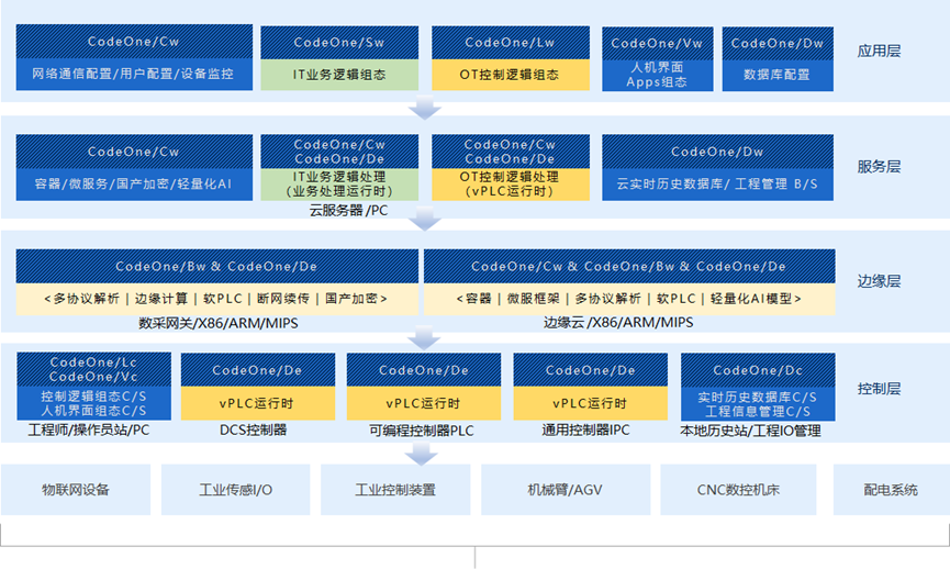 CodeOne工控軟件平臺面向不同設備廠商大/中/小型可編程邏輯控制器(PLC)和IPC提供統一無代碼組態編程環境、無差別編譯器與標準化運行時,軟件功能覆蓋工控系統的控制層、邊緣層、服務層和應用層(見下圖),支持“數據采集-智能處理-應用開發-反向控制”全鏈條閉環。控制層可集成軟PLC運行時內核,支持多種異構PLC/IPC硬件;邊緣層可支持EtherCAT、Profibus、OPC UA、MQTT等多種協議,集成邊緣計算、斷網續傳、國密算法;服務層集成容器、微服務技術和輕量化大語言模型,支持大容量數據存儲、周期定時/事件觸發/接口交互等多種類型的復雜邏輯編排處理服務;應用層集成支持IT與OT融合的PLC無代碼組態編程工具,支持端邊云協同的運動控制和PLC多機集群分布式控制等多種應用。