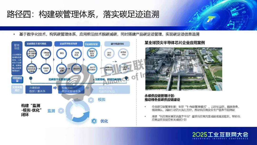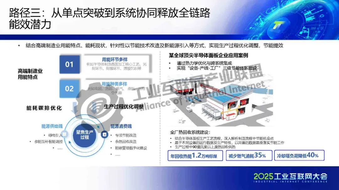 王輝介紹,中國高端制造業在數字化與綠色化協同轉型中面臨內憂外患:國內政策約束、國際碳壁壘、行業降本壓力及龍頭競爭倒逼。當前能碳管理粗放,數字化水平普遍偏低,且存在“能碳割裂”問題,能源與碳管理分屬不同部門,數據協同困難。轉型路徑聚焦綠色產品創新、核心工藝節能、端到端能源精細化管理、碳雙控拉通及產業鏈協同等五大方向。實踐案例顯示,通過AI+數字化工具優化供應鏈、光儲充集成及工藝革新,單產能耗可降40%,碳稅轉為碳資產收益。未來需打破組織壁壘,以數據驅動實現能碳一體化,推動高端制造業綠色競爭力升級。