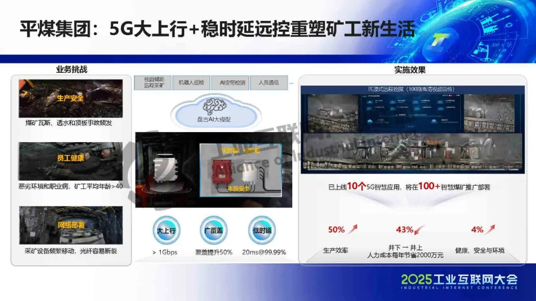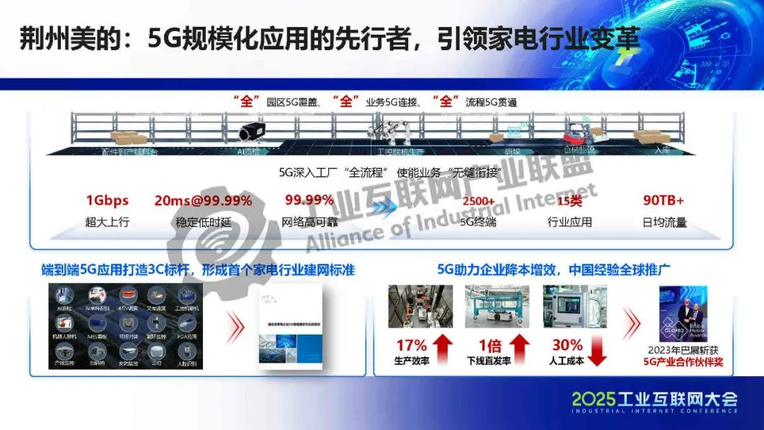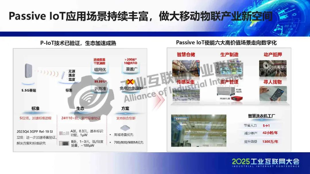 鄒向毅介紹,5G技術已具備確定性能力,如大上行(700Mbps)、穩時延(8±4ms)、準定位(1-3m),并通過廣域/局域專網架構服務千行百業。5G行業模組和終端形態豐富,成本持續下降,加速了工業應用落地。政策支持與行業標準(如化工、礦山領域)進一步推動5G規模化應用,目標覆蓋7萬企業、1億終端連接。典型案例包括:平煤集團利用5G實現遠程采礦,效率提升50%;荊州美的通過全流程5G貫通,降低人工成本30%;勝利油田借助5G無盲區覆蓋,年省巡檢成本260萬元;萬華化學以5G專網提升生產安全80%。此外,5G-A新方案(毫米波、Passive IoT、通感一體)將進一步釋放潛力,如毫米波實現亞米級定位,Passive IoT免電池覆蓋200米,通感一體助力低空安防。華為5G已賦能制造、電網等80個行業大類,專網超4萬個,持續推動工業數字化提質增效。