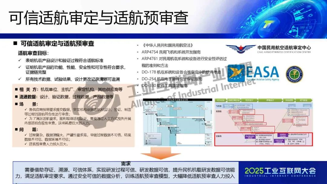可信適航審定與適航預審查:需要借助存證、溯源、可信體系,實現研發過程可信、研發數據可信,提升民機機載研發數據可信能力,滿足適航審定要求。通過安全可信的數據分析,訓練適航預審查模型,大幅降低適航預審查人力投入。