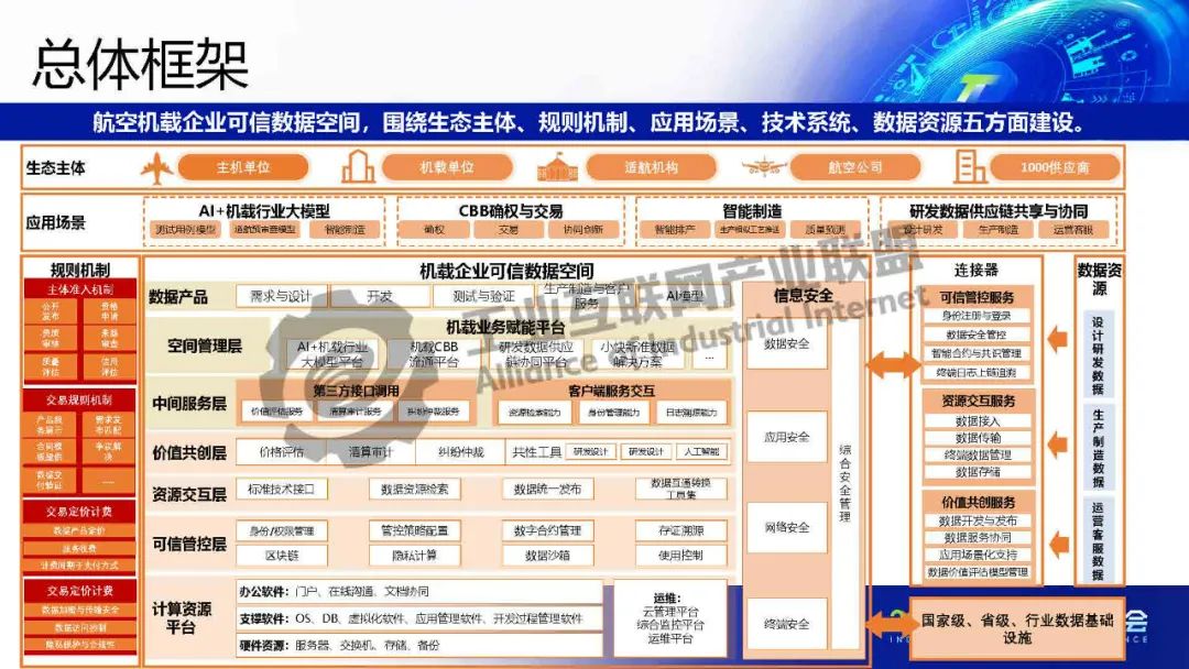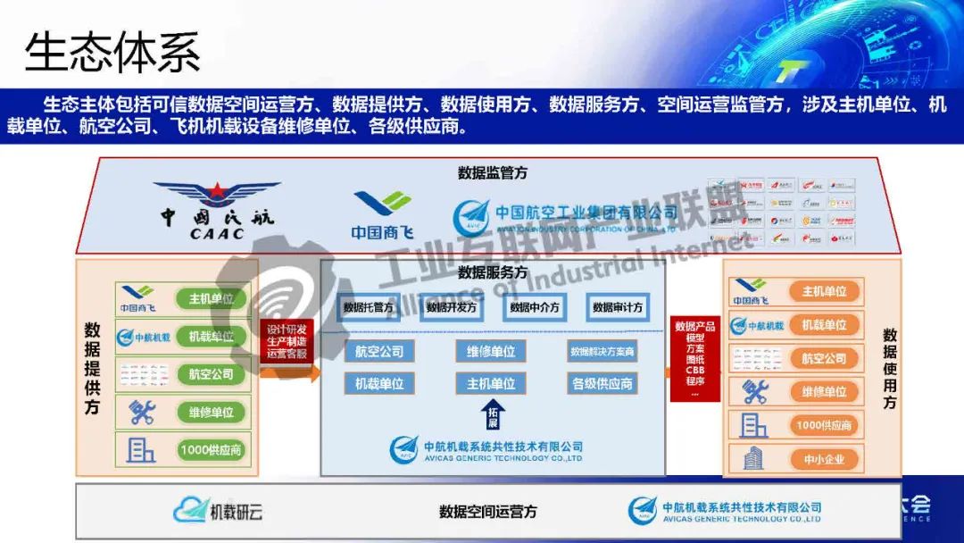 周振興介紹,為貫徹落實國家大飛機戰略,搶抓民機發展的歷史機遇,以C919、AG600、MA700研制、CR929競標等為契機,以產品適航審查為抓手,構建符合民機適航標準的民機可信數據空間,實現研制數據可信流通,促進各相關方協作,建立航空機載數據基礎設施,助力航空機載產業發展,完善國家產業布局。航空機載可信數據空生態主體包括可信數據空間運營方、數據提供方、數據使用方、數據服務方、空間運營監管方,涉及主機單位、機載單位、航空公司、飛機機載設備維修單位、各級供應商。