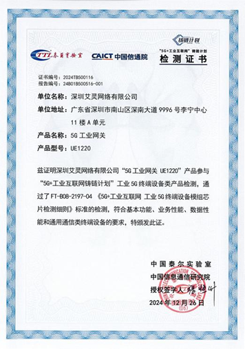 近日,深圳艾靈網(wǎng)絡有限公司自主研發(fā)的UE1220工業(yè)5G網(wǎng)關順利通過第一批“5G+工業(yè)互聯(lián)網(wǎng)”鑄鏈計劃產品測試,測試內容涵蓋5G NR基本功能、業(yè)務性能、數(shù)據(jù)性能和通信類終端功能等方面。