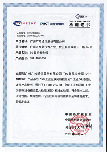 近日,廣州廣哈通信股份有限公司自主研發的GHT-AQM1000 5G智能安全帽順利通過第一批“5G+工業互聯網”鑄鏈計劃產品測試,測試內容涵蓋5G NR基本功能、業務性能、數據性能和行業應用終端功能等方面。