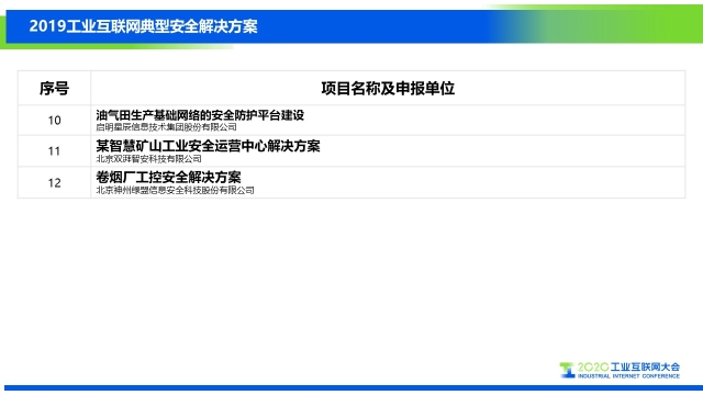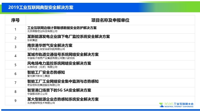 為使廣大工業(yè)互聯(lián)網(wǎng)從業(yè)者能了解工業(yè)互聯(lián)網(wǎng)安全的發(fā)展情況,AII安全組啟動匯編了《工業(yè)互聯(lián)網(wǎng)典型安全解決方案案例匯編(2019)》,報告共匯編了業(yè)內(nèi)12個典型安全解決方案,具體名單如下: