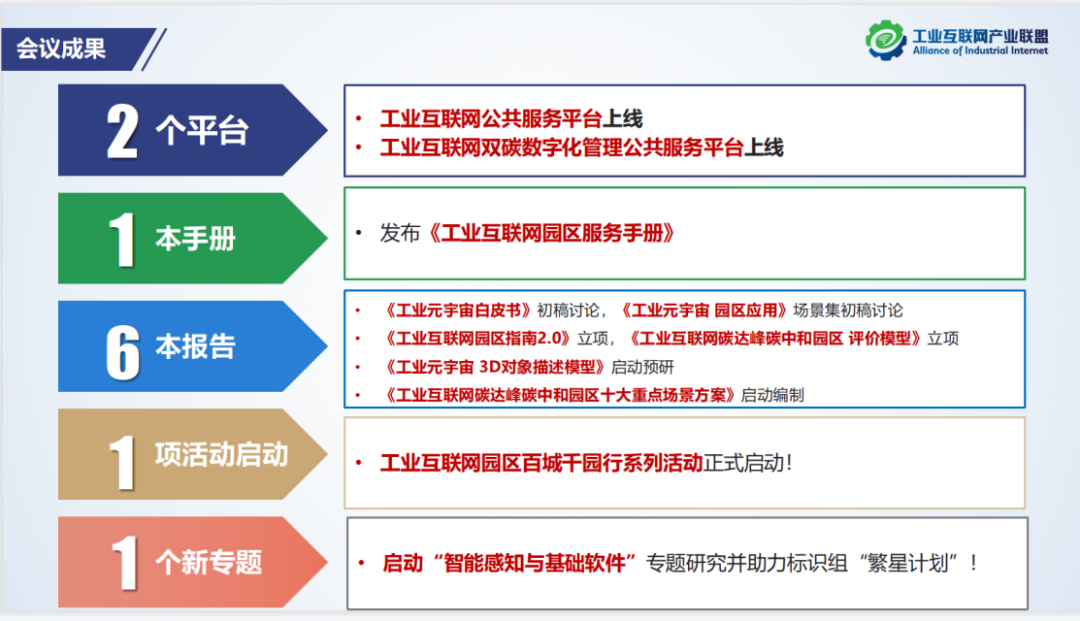 會上,正式發布了工業互聯網園區公共服務平臺,啟動工業互聯網園區“百城千園行”系列活動,介紹了即將上線的工業互聯網雙碳數字化管理公共服務平臺,對《工業互聯網園區服務手冊(初稿)》進行了解讀。經討論,會議確定啟動《工業互聯網園區指南2.0》編制、《工業互聯網碳達峰碳中和園區 評價模型》標準立項、《工業元宇宙 3D對象描述模型》預研、《工業互聯網碳達峰碳中和園區十大重點場景方案》編制。會議審議了《工業元宇宙白皮書》征求意見稿、《工業元宇宙 園區應用場景集》初稿。工業互聯網、雙碳和元宇宙“三輪驅動”工業互聯網園區發展。總體組會議結合工業芯片、工業操作系統、標識組“繁星計劃”,討論了在聯盟啟動相關專題研究的必要性。