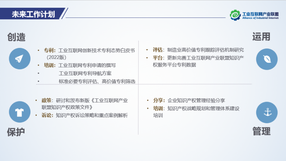 下一步,知識產權特設組將組織專家進一步完善政策文件,以更好的促進聯盟創新成果保護和運用。同時將知識產權工作與其他工作組結合,以需求為導向推動知識產權賦能工業互聯網技術研發、企業創新和產業安全的價值體現。