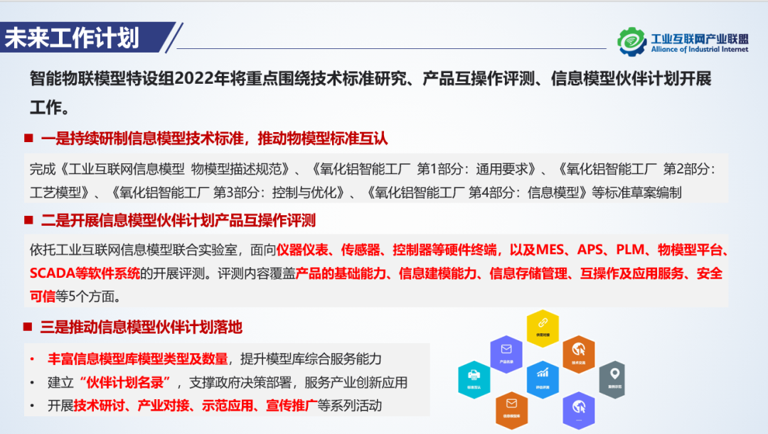 下一步,智能物聯模型組將重點通過信息模型標準研制、信息模型庫建設、產品互操作評測、示范應用等工作來推動信息模型伙伴計劃的落地。