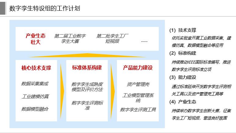 下一步,數字孿生特設組將加快《工業數字孿生成熟度模型與評價方法》國際標準編制,推動《工業數字孿生評測驗證》標準在聯盟評審及發布,并基于標準同步開發應用成熟度評測系統,加快評測服務推廣。持續探索多模型融合及模型互操作工程化應用,并籌備開展第二屆工業數字孿生大賽。