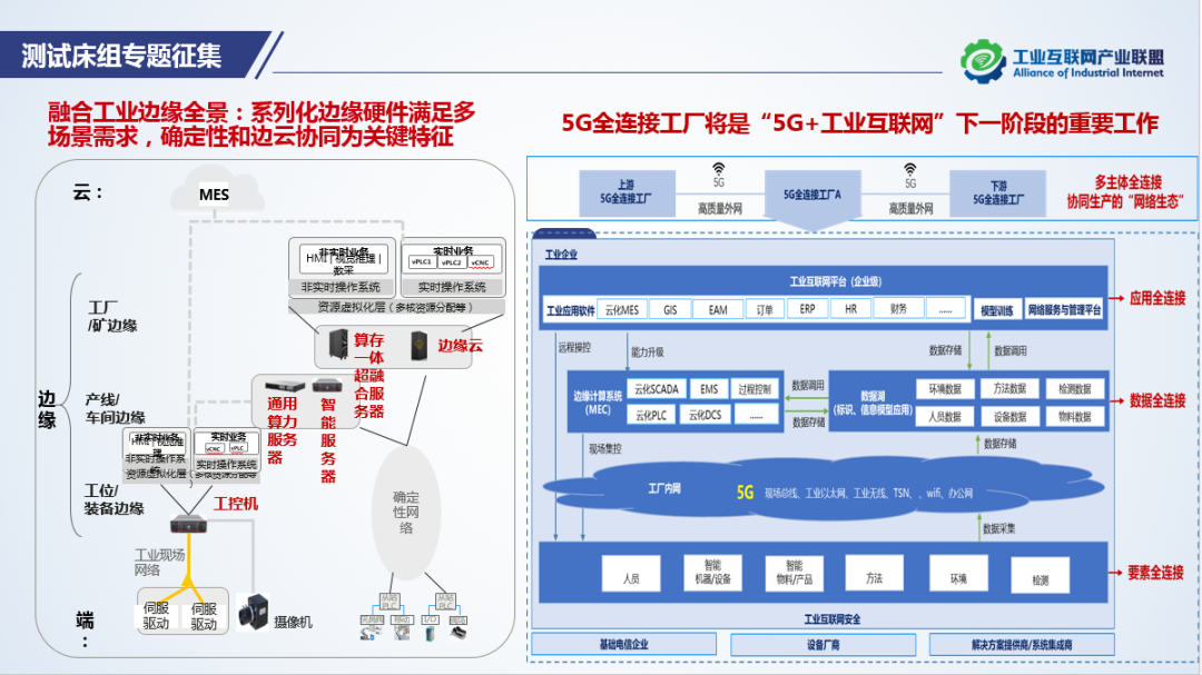 測試床組會議由副主席邱晨主持。首先,邱晨對測試床組定位、工作方向、上年度工作內容及本年度征集專題做了簡要介紹。隨后,中國移動、海爾、中國聯通及浙江藍卓4家責任單位分別就早期立項測試床進行結題工作匯報,并與評審專家進行技術研討交流。華為 “5G URLLC下沉工業OT層應用測試”以及新華三“海爾智能工廠SDN+TSN融合測試床”作為中期審核項目,取得的階段性進展獲得了參會專家的充分肯定。在熱點專題研討環節中,邀請到中國信通院標準所王哲博士,聯盟副秘書長沈彬,兩化所工業大數據總監趙志海及華為制造新機會孵化部專家姬亞南等,圍繞今年測試床組重點征集的工業邊緣及5G全連接工廠等方向同參會人員展開技術分享與交流。