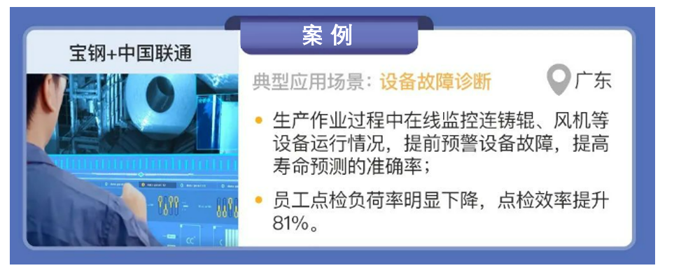 寶鋼與中國聯(lián)通合作,在廣東省湛江市開展“流程行業(yè) 5G+工業(yè)互聯(lián)網(wǎng)高質(zhì)量網(wǎng)絡(luò)和公共服務(wù)平臺”項目建設(shè),利用 5G 技術(shù)實現(xiàn)了連鑄輥、風(fēng)機(jī)等設(shè)備故障診斷場景的應(yīng)用。采集連鑄輥編碼、位置、所處區(qū)段受到的熱沖擊溫度、所處區(qū)段的夾緊力與鑄坯重力的合力等數(shù)據(jù),通過5G網(wǎng)絡(luò)實時傳輸至設(shè)備故障診斷等相關(guān)系統(tǒng),采用人工智能和大數(shù)據(jù)技術(shù)對不同區(qū)段的連鑄輥的壽命進(jìn)行預(yù)測,減少了現(xiàn)場布線的工作量,提高了壽命預(yù)測的準(zhǔn)確率。同時,采集風(fēng)機(jī)振動、電流、電壓、溫度、風(fēng)量等運行數(shù)據(jù),通過5G網(wǎng)絡(luò)實時傳輸至設(shè)備故障診斷等相關(guān)系統(tǒng),實現(xiàn)生產(chǎn)作業(yè)過程中風(fēng)機(jī)設(shè)備運行情況的在線監(jiān)控,提前預(yù)警設(shè)備故障,通過對風(fēng)機(jī)設(shè)備的在線監(jiān)控,員工點檢負(fù)荷率明顯下降,點檢效率提升 81%。