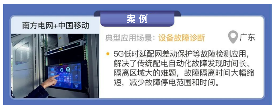 南方電網(wǎng)與中國移動合作,在廣東省廣州市開展了“5G+智能電網(wǎng)”項目建設(shè),實現(xiàn)了設(shè)備故障診斷場景的應(yīng)用。在配網(wǎng)差動保護(hù)應(yīng)用中,利用電力專用5G用戶前置設(shè)備(CPE)進(jìn)行高精度網(wǎng)絡(luò)授時,通過5G網(wǎng)絡(luò)低時延特性,采集配電網(wǎng)電流相量數(shù)據(jù),傳輸至配電自動化主站,及時掌握線路情況,并進(jìn)行在線監(jiān)測和診斷,發(fā)現(xiàn)故障區(qū)段后,依靠配電自動化主站進(jìn)行故障隔離和供電恢復(fù),解決了傳統(tǒng)配電自動化故障發(fā)現(xiàn)時間長、故障隔離區(qū)域大的問題,將故障隔離時間大幅縮短,最大程度減少故障停電范圍和時間。