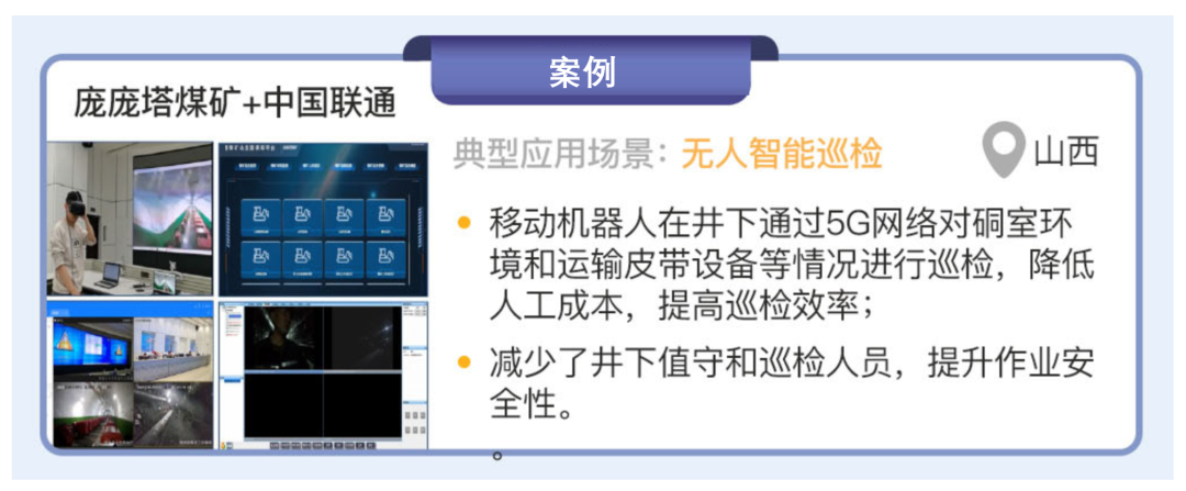 龐龐塔煤礦與中國聯通合作,在山西省開展“5G+智能礦山”項目建設,實現了無人智能巡檢場景的應用。項目在井下變電硐室和水泵房的排水、供電等設備遠程集中監控的基礎上,增加安裝 5G 模組的巡檢機器人,通過5G網絡進行硐室 4K 高清視頻回傳、機器人監測數據回傳和機器人實時控制,5G 技術支撐實現運輸機、皮帶等設備的無人巡檢,降低運輸環節的人工成本,提高巡檢效率,實現了井下固定崗位無人值守和無人巡檢,減少了井下作業人員,提升了作業安全性。