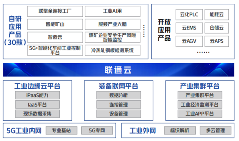 為進一步推動“5G+工業互聯網”實現規模和價值的雙重躍升。中國聯通一直致力于打造“5G+工業互聯網”第一品牌,依托運營商云網優勢,歷經多年實踐,整合生態資源,初步形成了“一朵云、兩張網、三平臺”的工業互聯網產品能力體系打造了30款自研應用產品,形成完整的端到端產品體系。目前已經深入裝備制造、服裝、礦山、汽車、鋼鐵、計算機電子、家電、石油化工、電力熱力、建材、港口等11大行業,與合作伙伴攜手加速傳統產業向數字化、網絡化、智能化方向轉型升級。