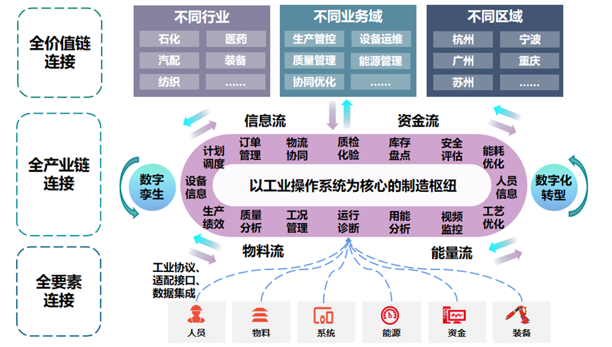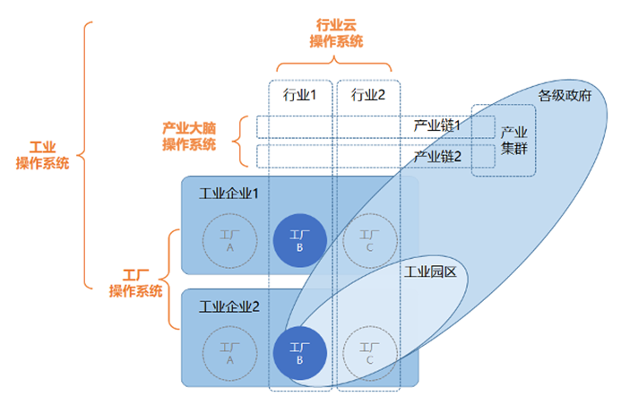 工業(yè)企業(yè)的生產(chǎn)與運營,需要產(chǎn)業(yè)上下游企業(yè)的協(xié)同支撐、受國家相關部門監(jiān)管。工業(yè)企業(yè)入園、區(qū)域塊狀經(jīng)濟發(fā)展、產(chǎn)業(yè)鏈整體提升等正在成為地方各級政府提振實體經(jīng)濟的重要手段。因此,當工業(yè)操作系統(tǒng)面向不同產(chǎn)業(yè)集群、不同產(chǎn)業(yè)鏈進行診斷、賦能時,可發(fā)展為立體形態(tài)的產(chǎn)業(yè)大腦操作系統(tǒng)。