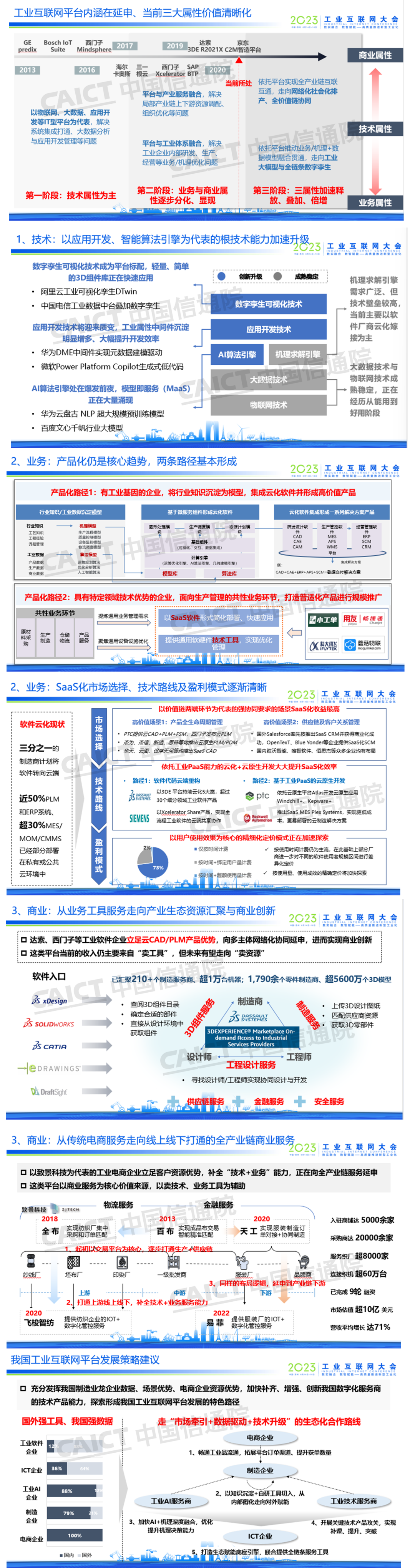 6月15日,2023工業(yè)互聯(lián)網(wǎng)大會(huì)在蘇州舉行,在“工業(yè)互聯(lián)網(wǎng)創(chuàng)新發(fā)展”論壇上,中國(guó)信息通信研究院信息化與工業(yè)化融合研究所工業(yè)互聯(lián)網(wǎng)技術(shù)產(chǎn)業(yè)創(chuàng)新研究部工程師侯羽菲指出,當(dāng)前工業(yè)互聯(lián)網(wǎng)平臺(tái)正在由單一技術(shù)屬性向技術(shù)、業(yè)務(wù)與商業(yè)三大屬性相互疊加演進(jìn)。在技術(shù)層面,數(shù)字孿生可視化、應(yīng)用開(kāi)發(fā)和人工智能算法引擎三大“根”技術(shù)創(chuàng)新加速;在業(yè)務(wù)層面,產(chǎn)品化與SaaS化是釋放平臺(tái)業(yè)務(wù)賦能價(jià)值的核心;在商業(yè)層面,“工具+資源”服務(wù)為平臺(tái)商業(yè)創(chuàng)新提供新機(jī)遇。