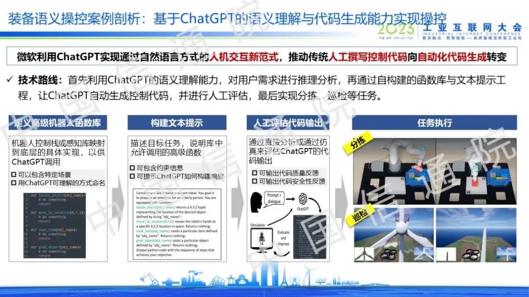 在裝備語義操控場(chǎng)景中,能夠利用ChatGPT的語義理解能力進(jìn)行機(jī)器人智能操控,其實(shí)現(xiàn)邏輯是定義高級(jí)機(jī)器人函數(shù)庫,再構(gòu)建文本提示,然后通過人工評(píng)估代碼輸出質(zhì)量,滿足質(zhì)量要求后機(jī)器人即可執(zhí)行分揀和巡檢等任務(wù),這意味著人機(jī)交互范式正在加速創(chuàng)新。
