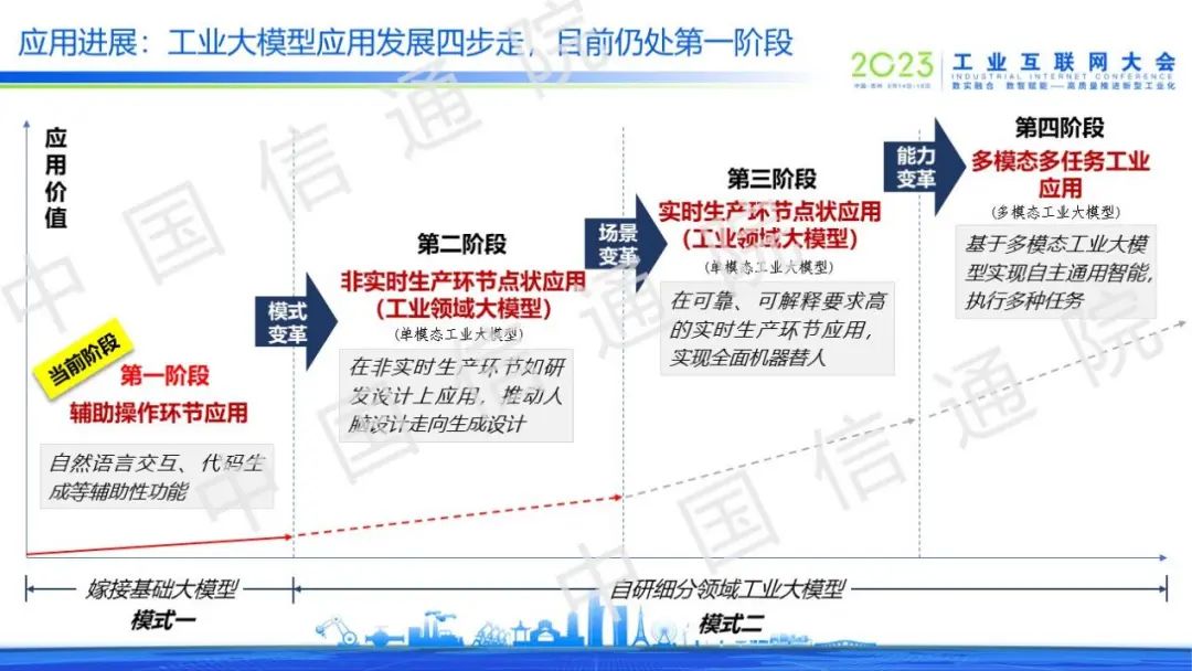 6月15日,2023工業(yè)互聯(lián)網(wǎng)大會(huì)在蘇州舉行,在“工業(yè)互聯(lián)網(wǎng)平臺(tái)創(chuàng)新發(fā)展”論壇上,中國(guó)信通院兩化所工互創(chuàng)新部王海萍指出,從應(yīng)用視角來看,工業(yè)大模型發(fā)展分為四個(gè)階段,當(dāng)前正處于以直接嫁接基礎(chǔ)大模型為主要模式的第一階段,并不斷向工業(yè)核心環(huán)節(jié)演進(jìn),逐步提升工業(yè)大模型多任務(wù)執(zhí)行能力;從產(chǎn)業(yè)視角來看,未來工業(yè)大模型有望形成“基礎(chǔ)大模型+領(lǐng)域大模型”的產(chǎn)業(yè)格局,其中領(lǐng)域大模型的企業(yè)主體類型將更加多樣、市場(chǎng)競(jìng)爭(zhēng)將愈加激烈。