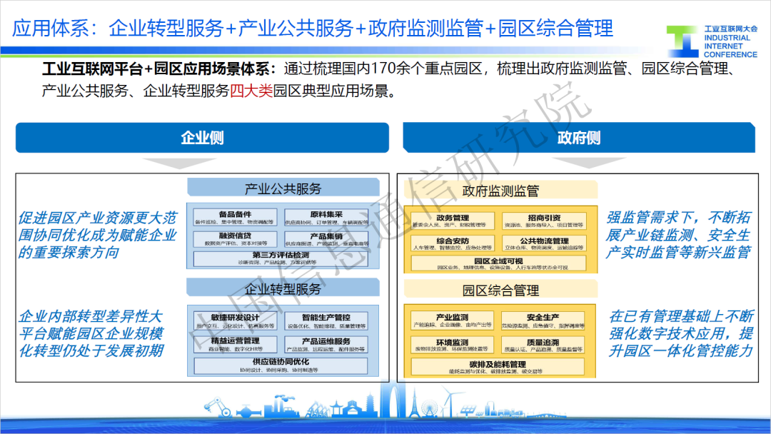 6月15日,2023工業(yè)互聯網大會在蘇州舉行,在“工業(yè)互聯網平臺創(chuàng)新發(fā)展”論壇上,中國信通院兩化所工互創(chuàng)新部楊昊亭發(fā)布了《“工業(yè)互聯網平臺+園區(qū)”典型場景》(以下簡稱“典型場景”)并進行了解讀。園區(qū)作為產業(yè)發(fā)展的主陣地,是推動我國經濟發(fā)展的重要引擎。“典型場景”圍繞園區(qū)高質量發(fā)展需求,提出了產業(yè)公共服務、企業(yè)轉型服務、政府監(jiān)測監(jiān)管、園區(qū)綜合管理四類應用場景,旨在為提升園區(qū)治理能力與加速產業(yè)轉型升級提供可借鑒的經驗和模式。