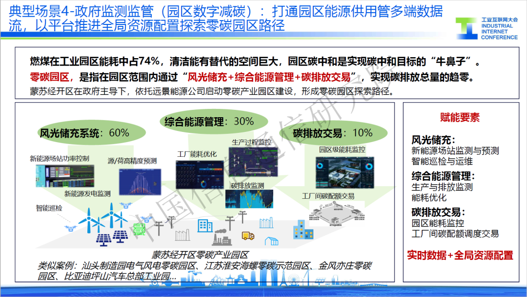 四是園區(qū)數字減碳,某產業(yè)園區(qū)通過“風光儲充+綜合能源管理+碳排放交易”實現零碳園區(qū)建設。在發(fā)電端,通過數據建模優(yōu)化,通過新能源發(fā)電監(jiān)測、源網荷儲調度等方式,優(yōu)化發(fā)電調度的效率;在用電端,通過工廠能耗優(yōu)化、生產過程管控等方式直接減少生產中的碳排放;在監(jiān)管端,提供碳監(jiān)控、碳核驗、碳交易等服務,實現資源的全局配置。