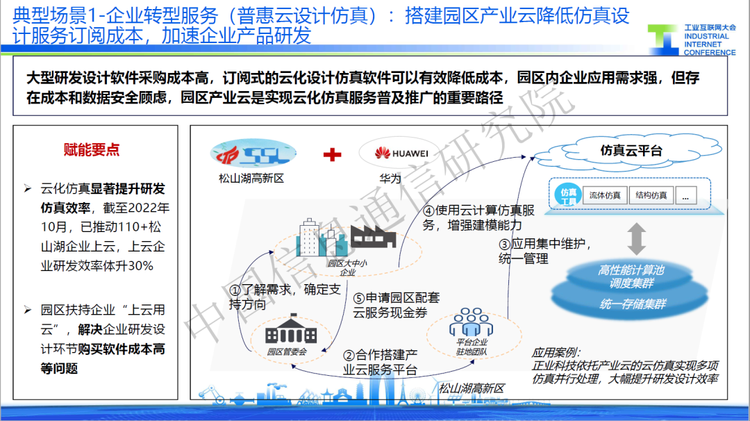 “典型場景”一是普惠云設計仿真,針對中小企業(yè)研發(fā)工具成本高的問題,某服務商通過建立仿真云平臺,一方面提供低成本的仿真工具,并基于平臺實現統(tǒng)一版本管理,降低企業(yè)使用成本。另一方面,打造高性能計算與存儲管理設施,為仿真工具提供算力支撐。目前,該應用已覆蓋110家中小企業(yè),實現研發(fā)效率提升30%。