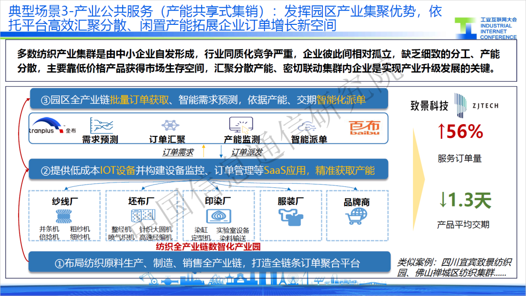 三是產能共享式集銷,紡織企業(yè)同質化競爭嚴重,缺乏細致的分工、產能分散,主要靠低價格產品獲得市場生存空間。某服務商針對紡織企業(yè)痛點打造集采集銷平臺,將訂單需求與企業(yè)生產拉通,通過智能化派單優(yōu)化提高資源配置效率,應用過程中有效提升企業(yè)訂單數量56%。