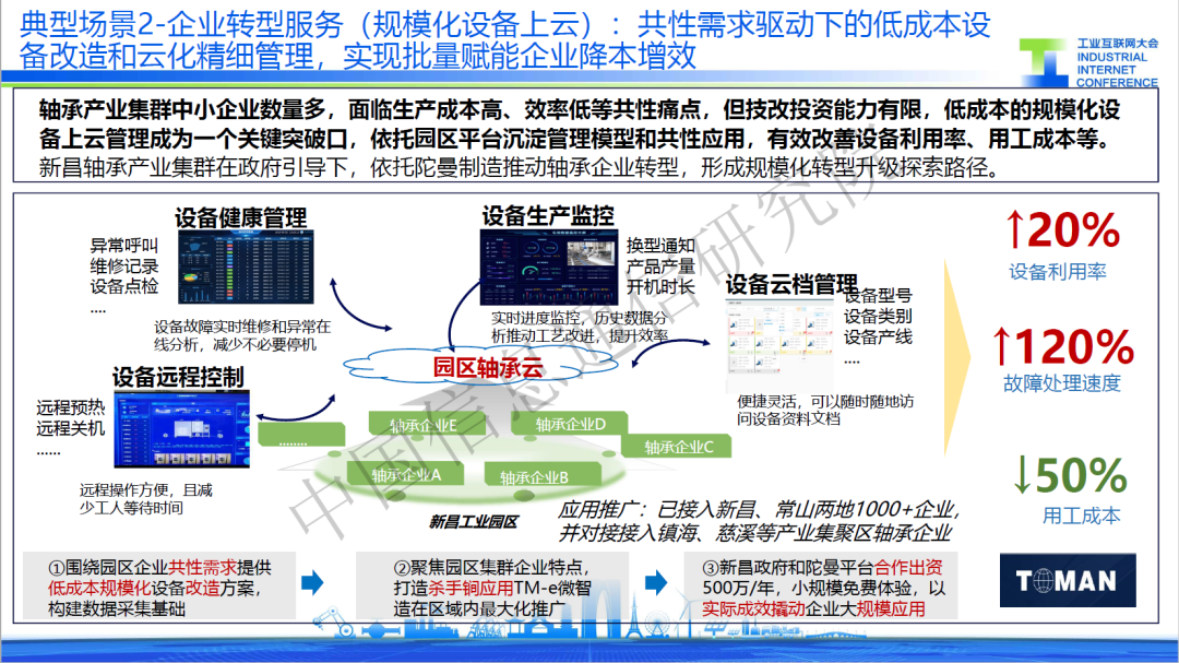 二是規(guī)模化設備上云,針對面向軸承產業(yè)集群中小企業(yè)數量多,設備停機率高的共性痛點,某服務商打造園區(qū)軸承云,提供設備遠程控制、設備健康管理、設備生產監(jiān)控等一系列殺手锏應用,通過對設備的管控有效減少停機時間,使得軸承行業(yè)綜合成本較改造前下降12%,利潤率也從改造前的4%提升到了8%。