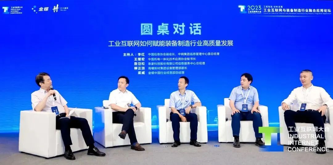 論壇現場,主題為《工業互聯網如何賦能裝備制造行業高質量發展》的圓桌對話成為焦點。中國信息協會副會長、中鋼集團信息管理中心原總經理李紅,中國機電一體化技術應用協會代理秘書長王繼宏,海螺新材設備管理部部長柳正頂,泰豪公司信息服務部總經理詹岱松,金蝶中國行業經營部總經理梁威共商共話,為制造業數字化轉型方法論及應用實踐提供了前瞻之道。