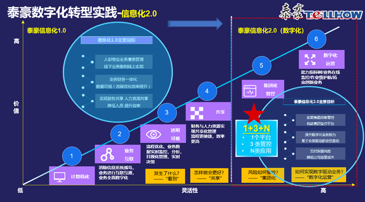 泰豪數字化轉型也是隨著企業發展的歷程而不斷發展。第一次和金蝶攜手是在2001年,隨著企業的發展,我們也是不斷在選擇更合適泰豪的解決方案。2016年隨著泰豪二次創業的目標,我們再次和金蝶做了數字化轉型1.0的建設,將集團財務、HR、業務管理一體化進行了全方位合作。最近兩年我們與金蝶在進行數字化轉型2.0的設計。1.0目標還是比較基礎,就是做人財物、全線上、業財一體、人才共享。2.0希望做到集團戰略管控,實現數字化業務的賦能,實時洞察經營管理風險,降低運營管理成本。