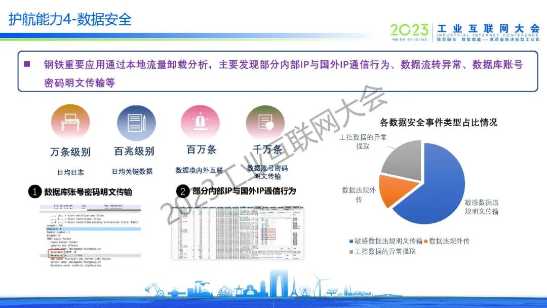 “鋼鐵重要應用通過本地流量卸載分析,主要發現部分內部IP與國外IP通信行為、數據流轉異常、數據庫賬號密碼明文傳輸等。“