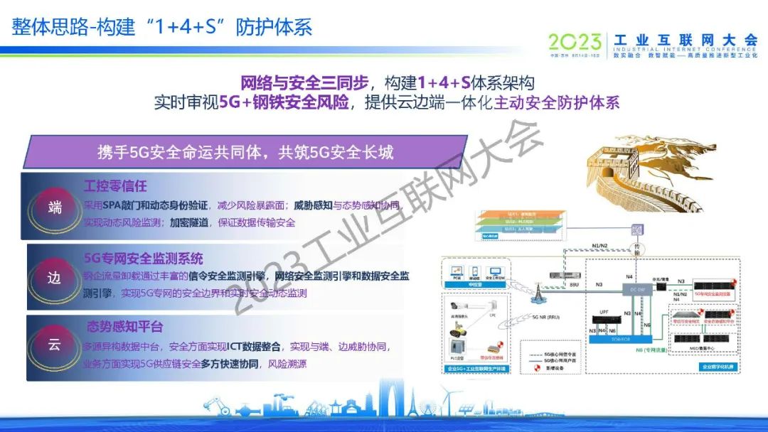 林飛指出,5G作為“新基建”七大領域之首,推動和支撐邊緣計算、云計算、大數據、人工智能、工業互聯網、數字孿生等新一代信息技術在鋼鐵企業落地生根,賦能鋼鐵行業數字化、智能化轉型發展。當前,鋼鐵5G專網面臨多種安全威脅,需要建立起網絡與安全三同步的規劃,構建“1+4+S”體系架構,從云、邊、端一體化建立起主動安全防護的體系。
