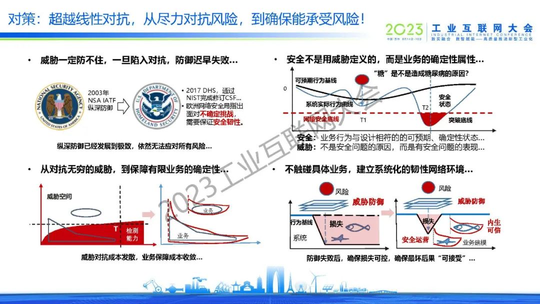 王雨晨指出,安全是產業數字化轉型中的“馬六甲海峽”,越有價值的系統,面臨的安全風險越大。對抗策略也需要超越線性對抗,從盡力對抗風險,到確保能承受風險。建立可信網絡:從一維線性的威脅防御,到三維系統性的安全保障,前置隔離區爭取最好情況,內網微隔離確保最壞結果可接受,運營管理區實現動態安全。