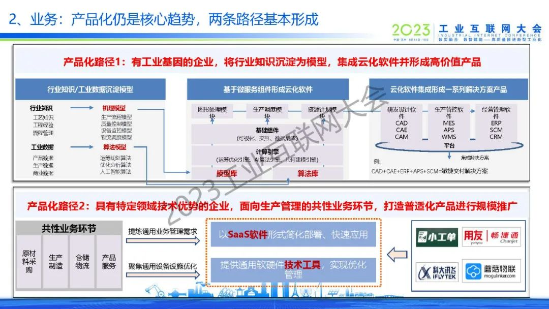 “工業互聯網平臺產品化的兩條路徑:一是有工業基因的企業,將行業知識沉淀為模型,集成云化軟件并形成高價值產品;二是具有特定領域技術優勢的企業,面向生產管理的共性業務環節,打造普適化產品進行規模推廣。”