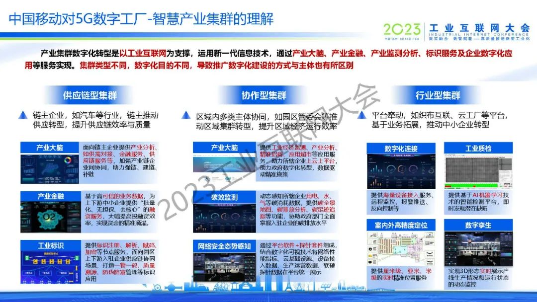 陳豫蓉表示,中國(guó)移動(dòng)組建軍團(tuán)推動(dòng)5G數(shù)字工廠的建設(shè),提供“頂設(shè)規(guī)劃-解決方案-標(biāo)準(zhǔn)產(chǎn)品”全棧服務(wù),支撐解決方案“融云網(wǎng)、融平臺(tái)、融應(yīng)用”一體化部署。她介紹到,產(chǎn)業(yè)集群數(shù)字化轉(zhuǎn)型是以工業(yè)互聯(lián)網(wǎng)為支撐,運(yùn)用新一代信息技術(shù),通過(guò)產(chǎn)業(yè)大腦、產(chǎn)業(yè)金融、產(chǎn)業(yè)監(jiān)測(cè)分析、標(biāo)識(shí)服務(wù)及企業(yè)數(shù)字化應(yīng)用等服務(wù)實(shí)現(xiàn)。集群類(lèi)型不同,數(shù)字化目的不同,導(dǎo)致推廣數(shù)字化建設(shè)的方式與主體也有所區(qū)別。