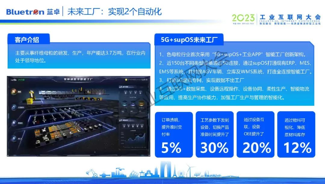 在蘇州本地,藍卓打造了纖維母粒行業(yè)首個5G+工業(yè)操作系統(tǒng)+工業(yè)APP的智能工廠。通過supOS對該企業(yè)近150臺不同類型設備進行5G連接,打通現(xiàn)有ERP、MES、EMS等系統(tǒng),對接AGV車輛、立庫及WMS系統(tǒng),從而打造了5G全連接智能工廠。通過設備遠程操作、設備協(xié)同、柔性生產(chǎn)、智能物流等應用,不僅提高了企業(yè)的生產(chǎn)協(xié)作能力,也加強工廠生產(chǎn)與管理的智能化。換句話說,實現(xiàn)了工業(yè)現(xiàn)場的生產(chǎn)制造的自動化,也實現(xiàn)了經(jīng)營管理的自動化。