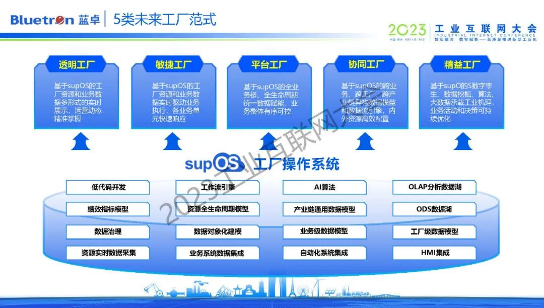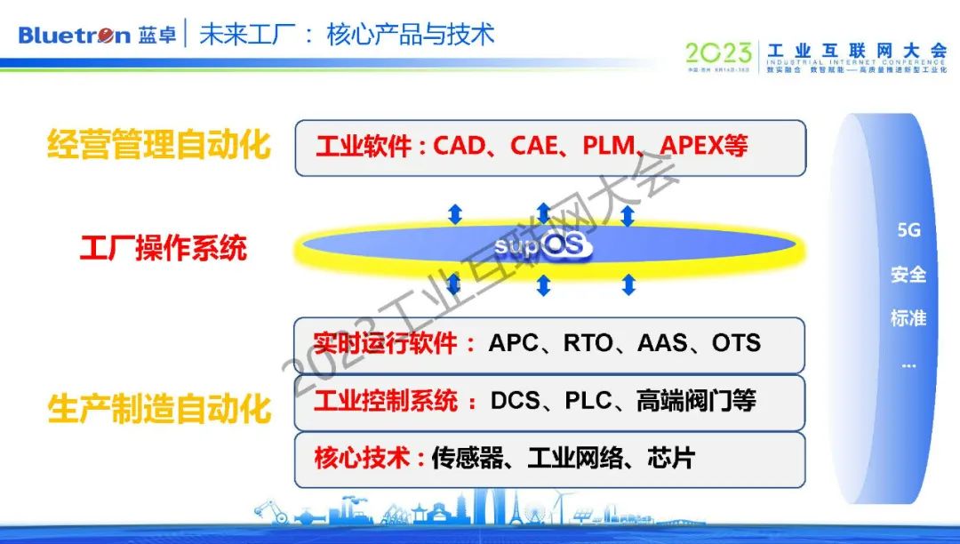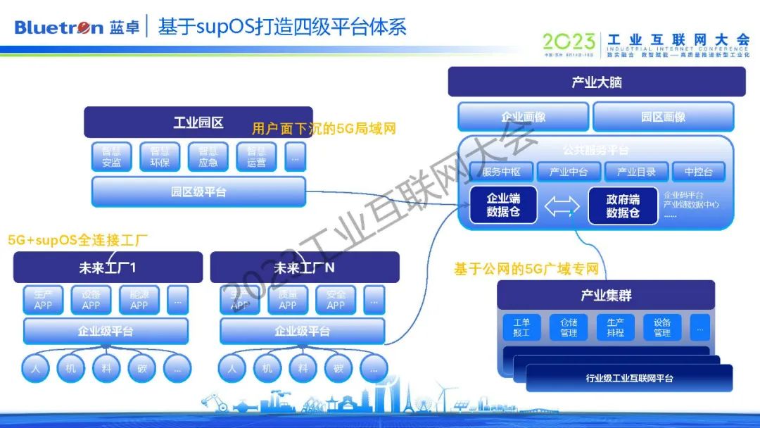 第二個是工業(yè)操作系統(tǒng),它是整個工廠的數(shù)字化轉(zhuǎn)型底座,可以連接工廠海量設備,打通工廠所有系統(tǒng),將數(shù)據(jù)集成同一個底座上,同時這個底座上有大量的預制件、組件、算法等。目前,藍卓supOS工業(yè)操作系統(tǒng)正通過平臺+APP的模式顛覆傳統(tǒng)工廠的五層架構(gòu),逐漸形成了企業(yè)、園區(qū)、行業(yè)、產(chǎn)業(yè)四級平臺體系。