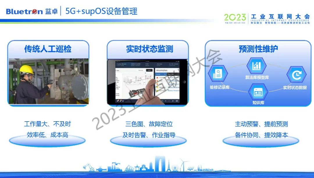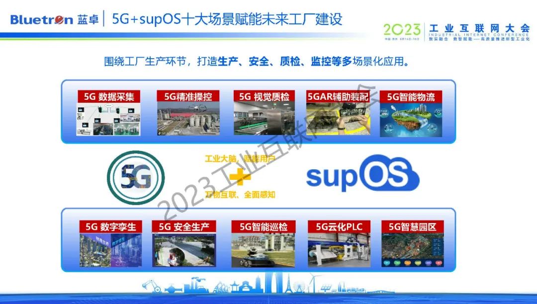 為加速企業(yè)完成生產(chǎn)制造自動化和經(jīng)營管理自動化,從而走向未來工廠,藍卓不斷探索supOS工業(yè)操作系統(tǒng)與前沿技術的的創(chuàng)新融合,而5G技術為工業(yè)操作系統(tǒng)提供了更多元化的賦能手段和想象空間。目前,supOS圍繞生產(chǎn)、安全、質(zhì)檢、監(jiān)控等領域,打造了5G+數(shù)字孿生、5G+安全生產(chǎn)、5G+智能巡檢、5G+云化PLC等數(shù)十種場景化應用。