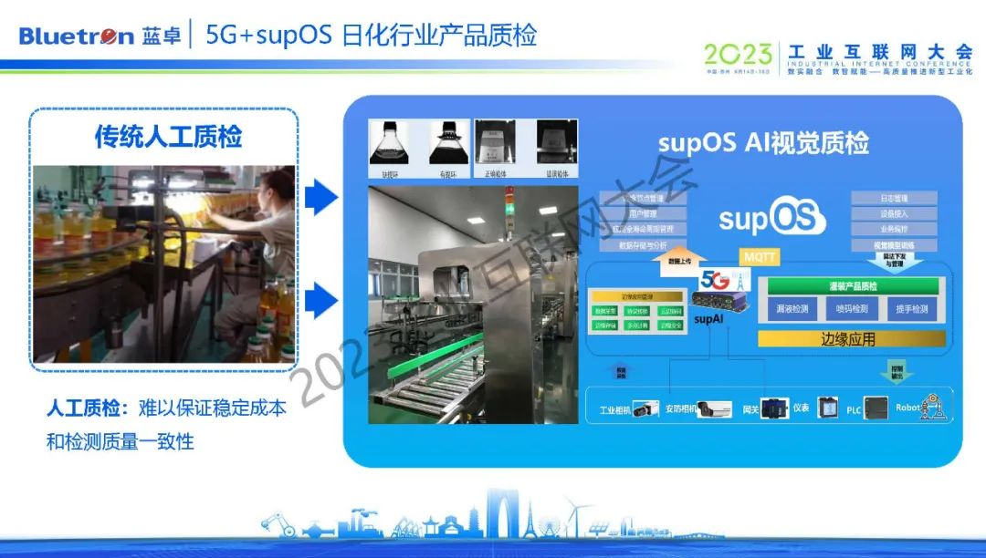 在一家位于安徽日化企業(yè),為確保符合安全包裝法,產(chǎn)品生產(chǎn)后,每條產(chǎn)線需要2-3個人配合以肉眼對產(chǎn)品外觀進行檢測。而supOS依托5G技術,打造了AI質(zhì)檢解決方案,通過工業(yè)攝像機采集視頻并實時上傳后臺,以AI算法檢測判斷。有效解決了傳統(tǒng)人工質(zhì)檢工作量大、漏檢、錯檢的問題。